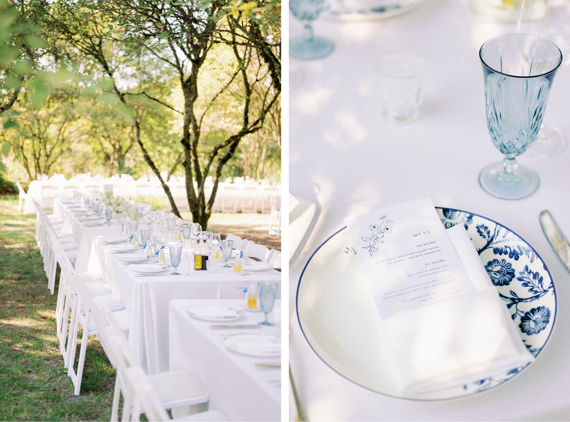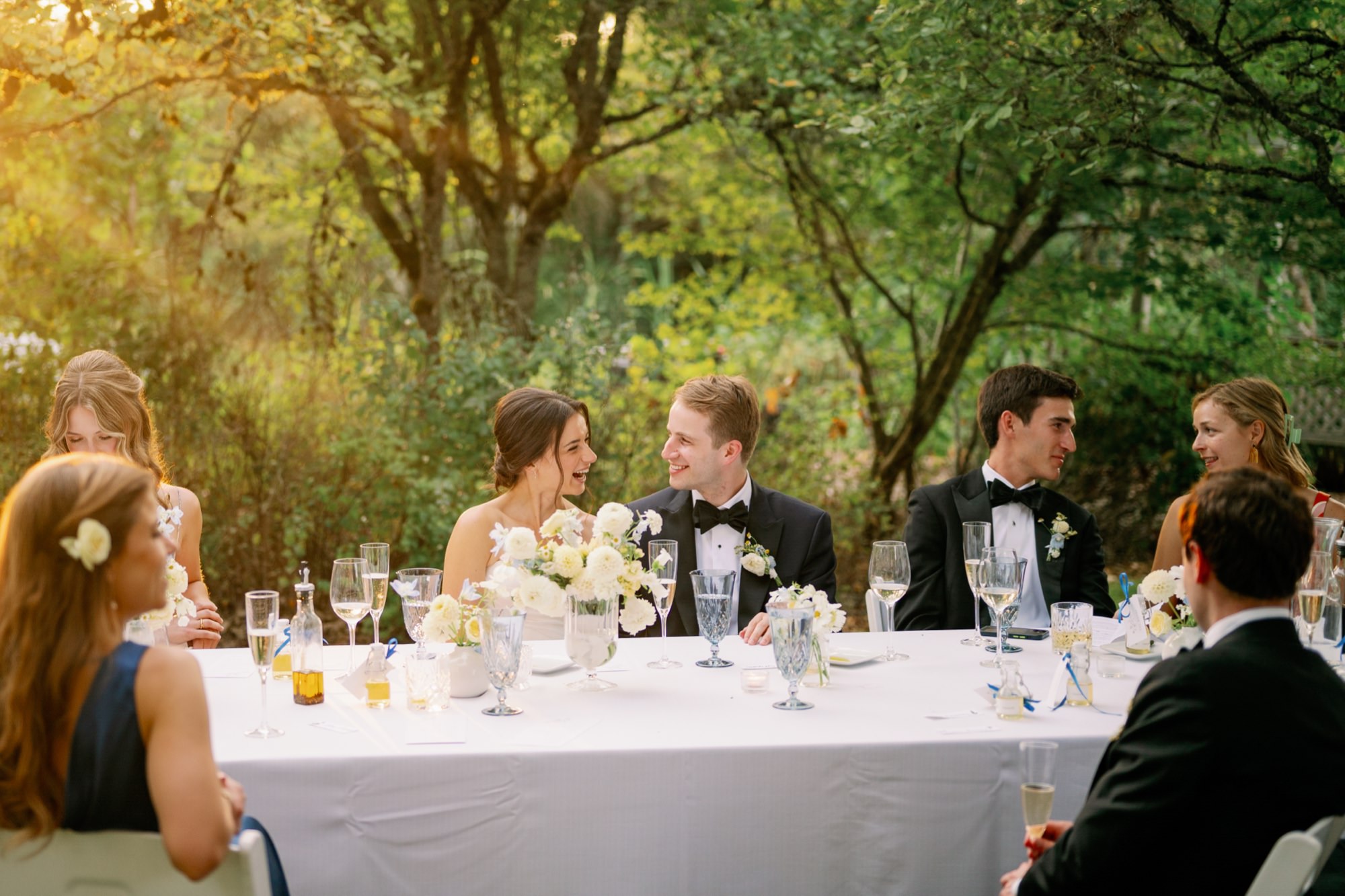 A stand of trees forms a natural canopy that feels inviting. Couples often use this area for dinner because long family-style tables fit beautifully under the branches, creating an intimate, communal setting. Seats up to 200 people.