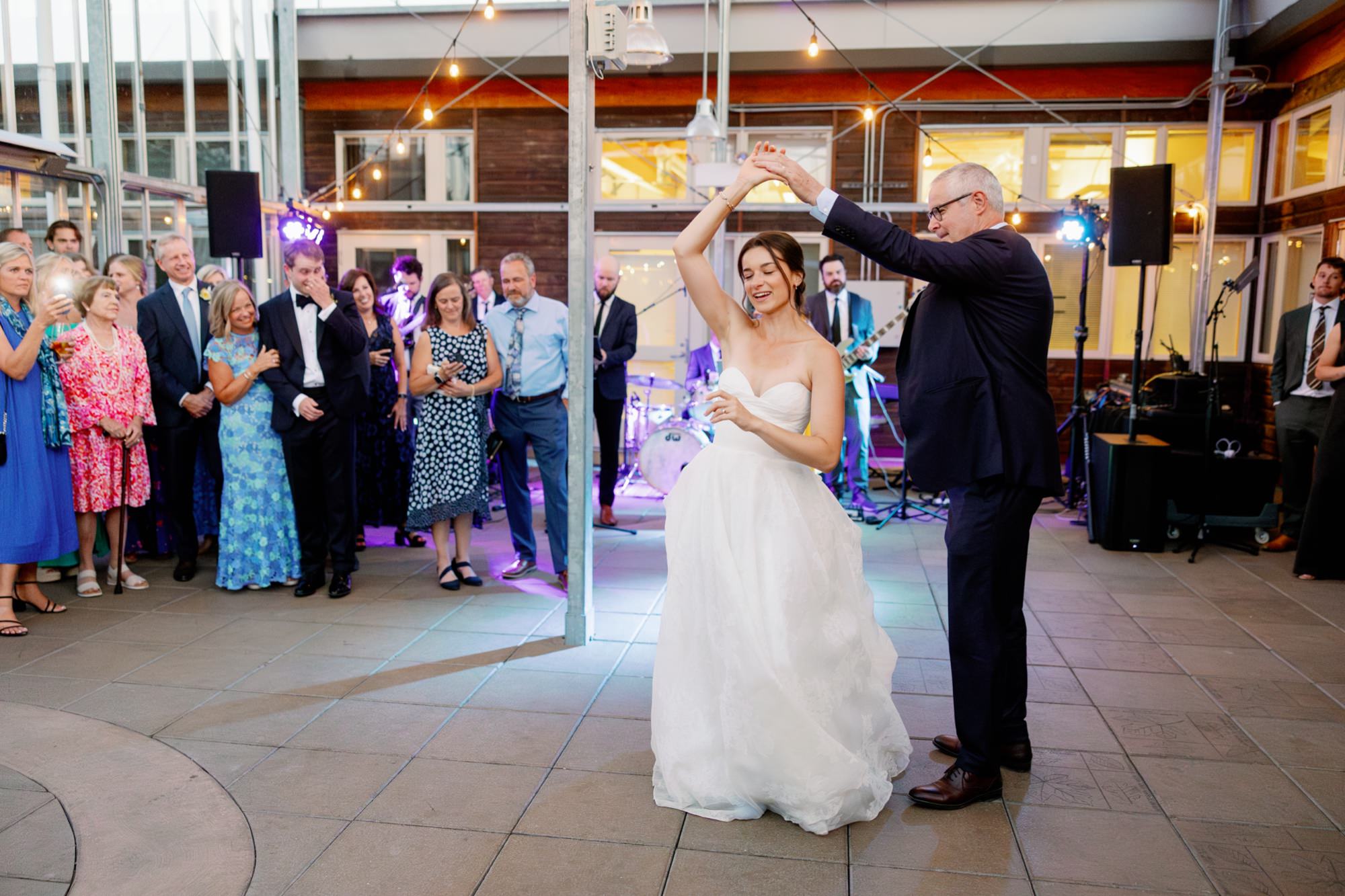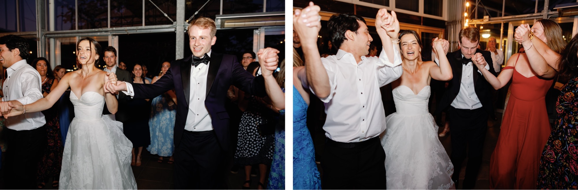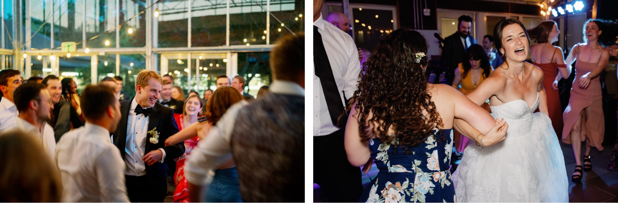The glass-walled atrium is a standout indoor space for a Center for Urban Horticulture wedding. It holds warmth and sound effectively for receptions while staying visually connected to the courtyard and garden. At night, the reflections and soft light create a beautiful atmosphere for dancing, speeches, and movement-filled photos.