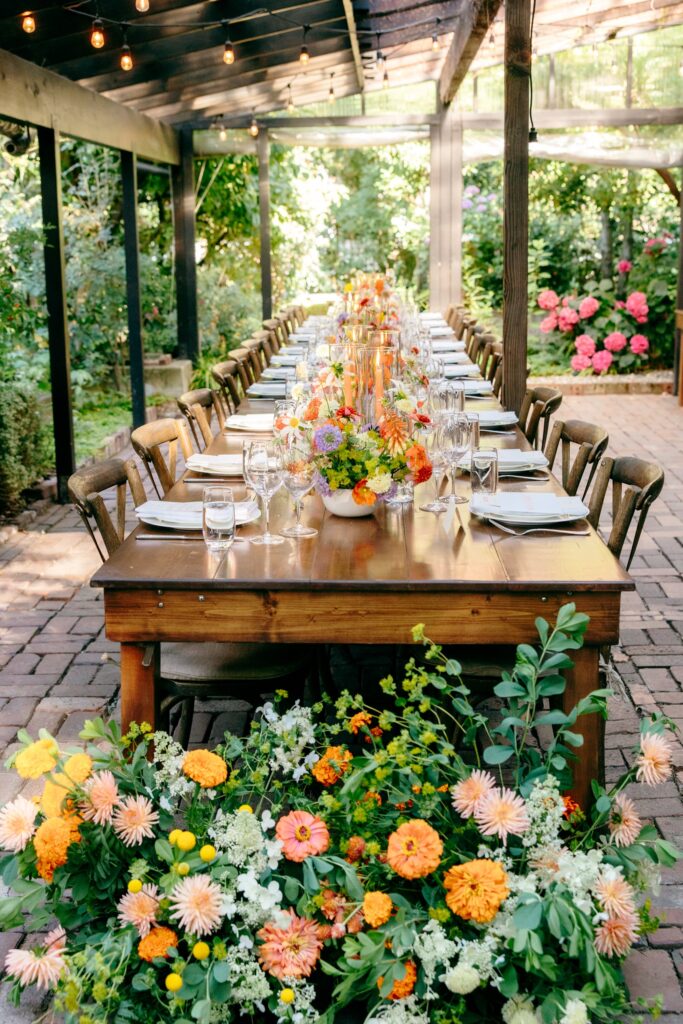 Dinner typically takes place in the North Yard, which is designed for communal, family-style meals. The main covered area works beautifully for longer tables and guest-focused dining, while another covered patio adds flexibility and breathing room. The setting encourages guests to settle in, linger, and enjoy the experience together. The lighting in this space is beautiful for photography!