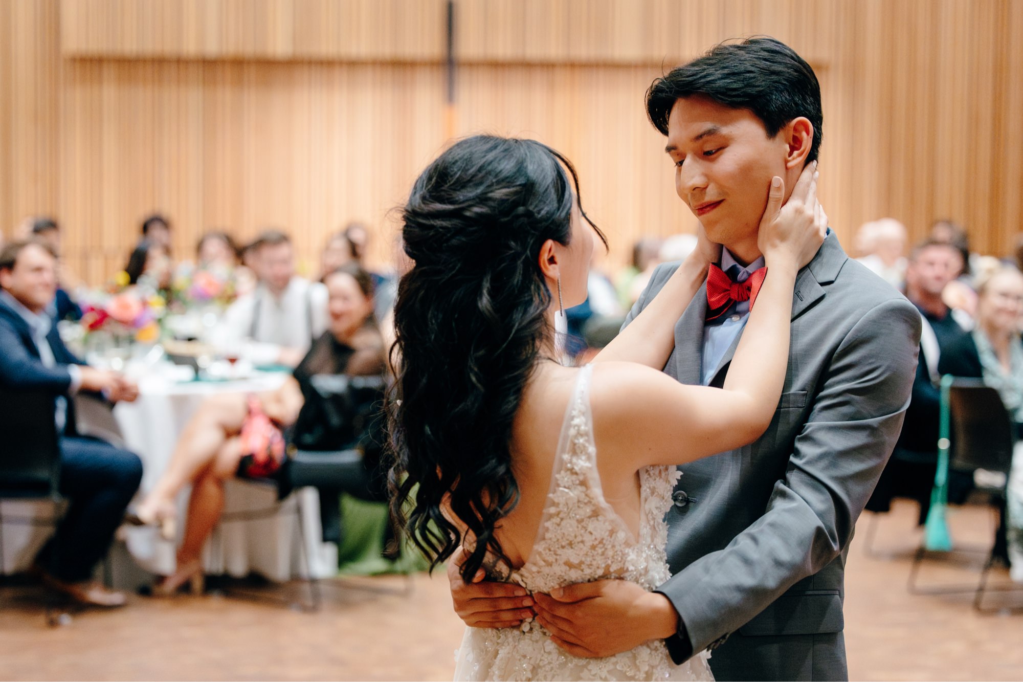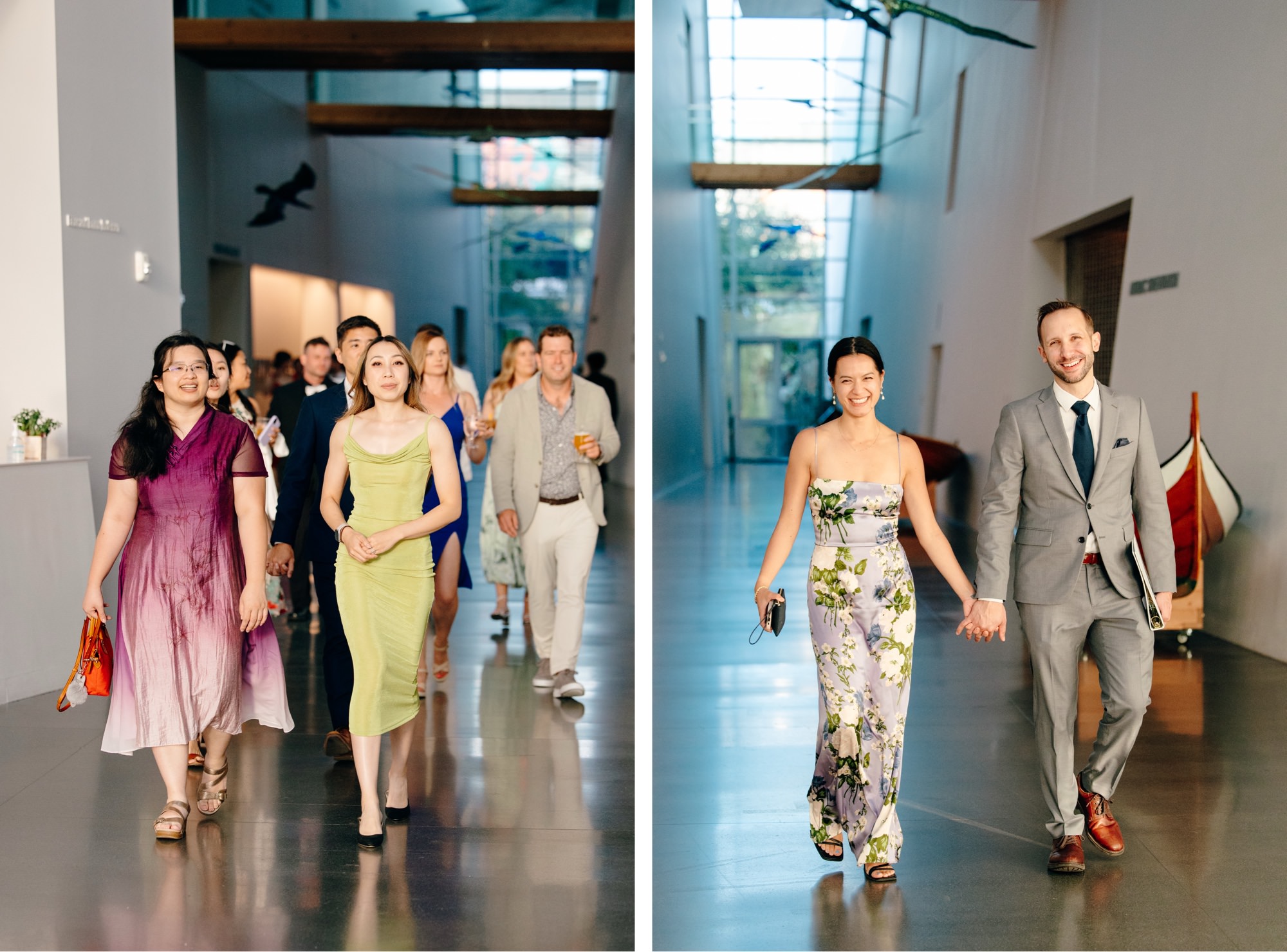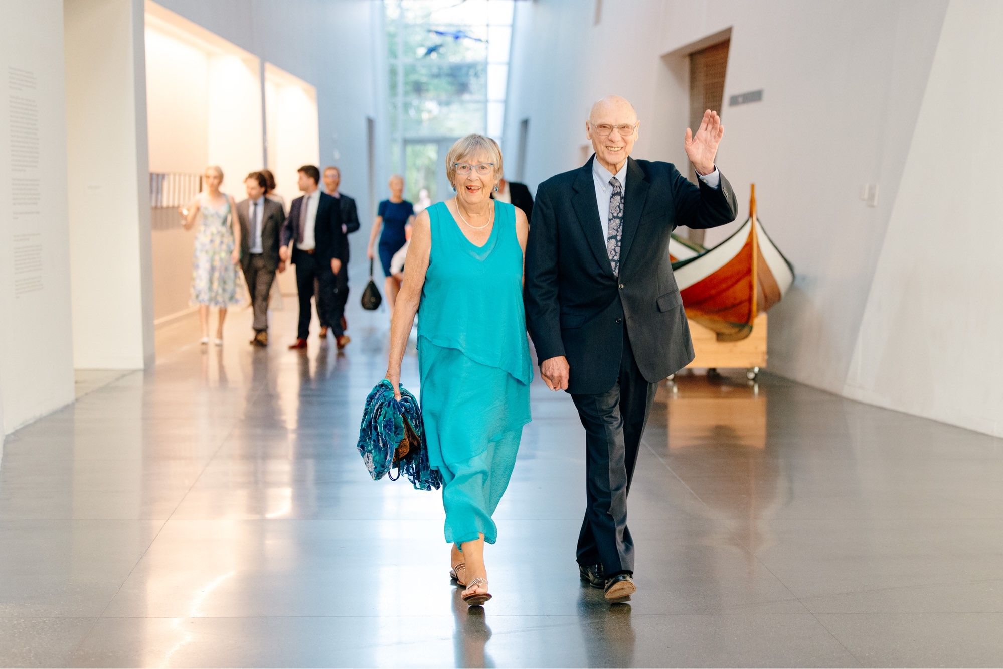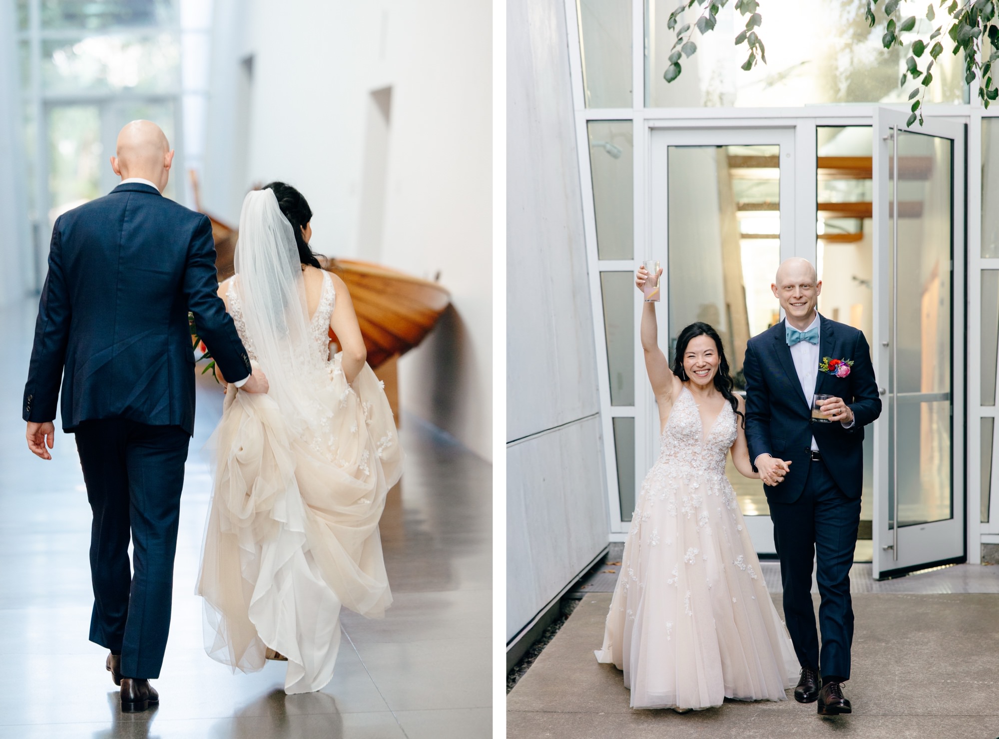 They chose to do their first look at The Nest in downtown Seattle, an intimate spot that perfectly captured the excitement and anticipation before heading to the museum for portraits. Their wedding day also happened to fall on the hottest day of the year, making the museum’s air-conditioned spaces and the shaded East Garden an enormous relief for both the couple and their guests.
