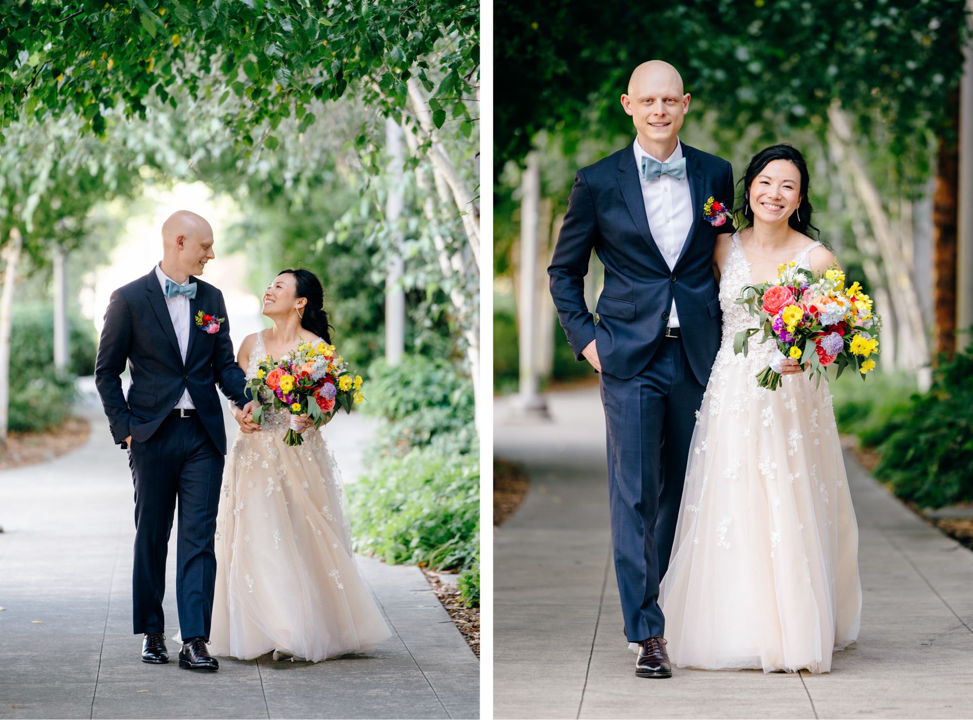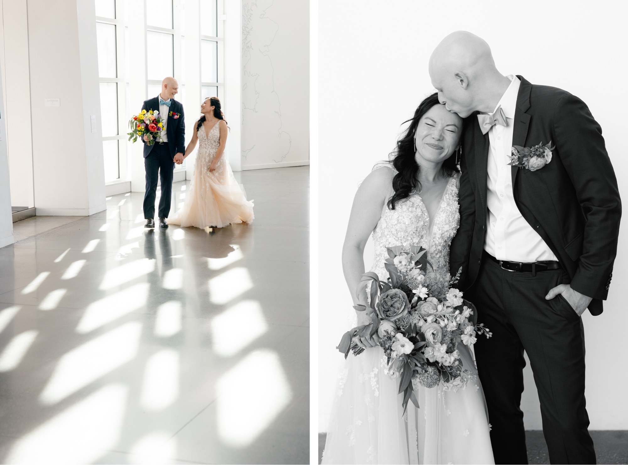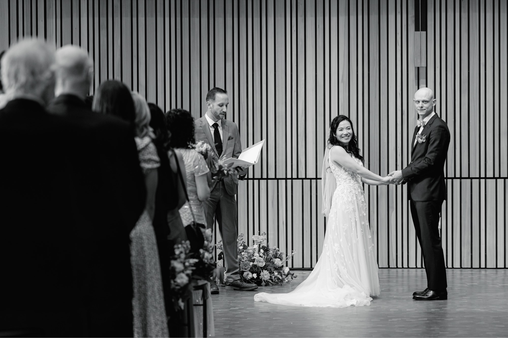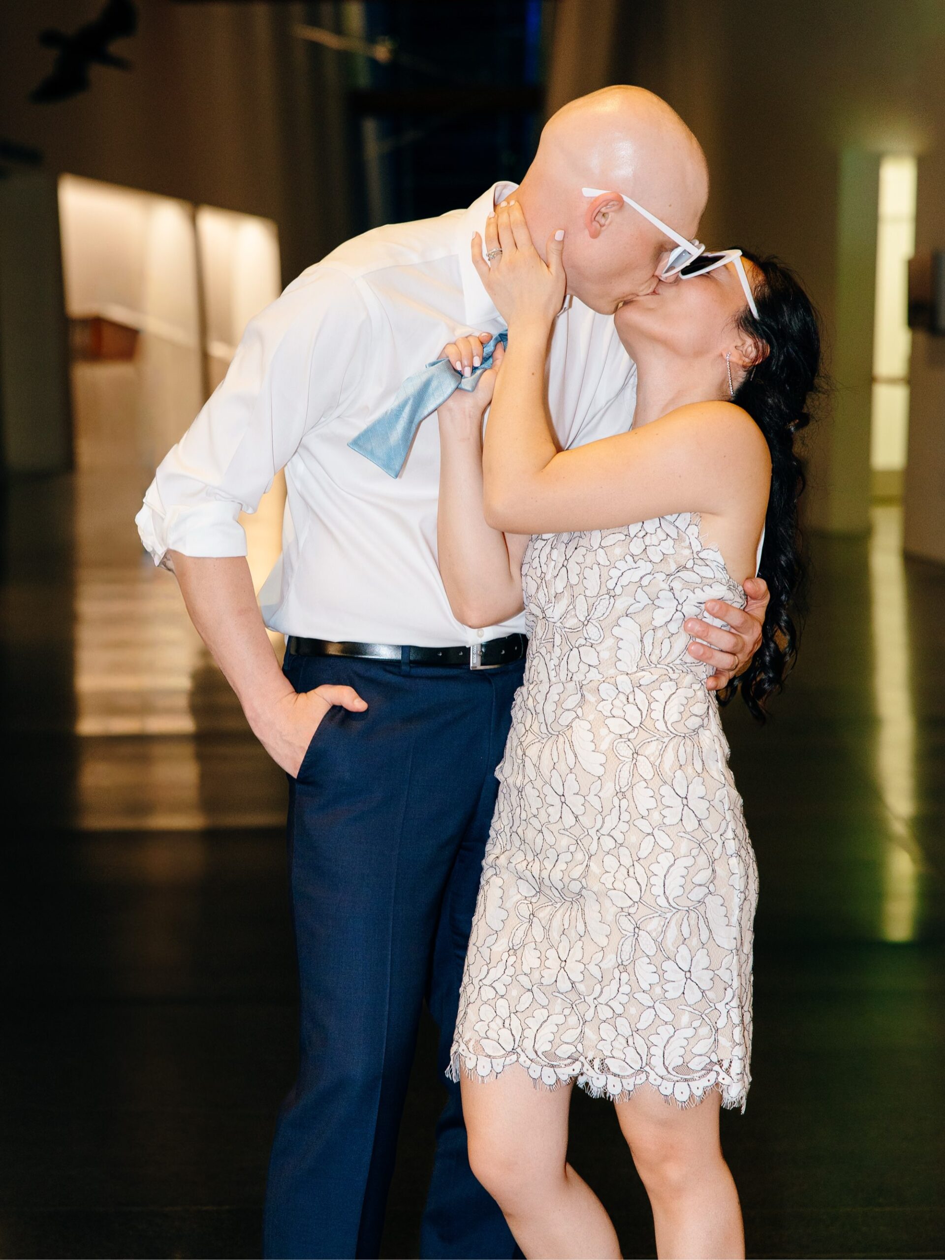 They chose to do their first look at The Nest in downtown Seattle, an intimate spot that perfectly captured the excitement and anticipation before heading to the museum for portraits. Their wedding day also happened to fall on the hottest day of the year, making the museum’s air-conditioned spaces and the shaded East Garden an enormous relief for both the couple and their guests.