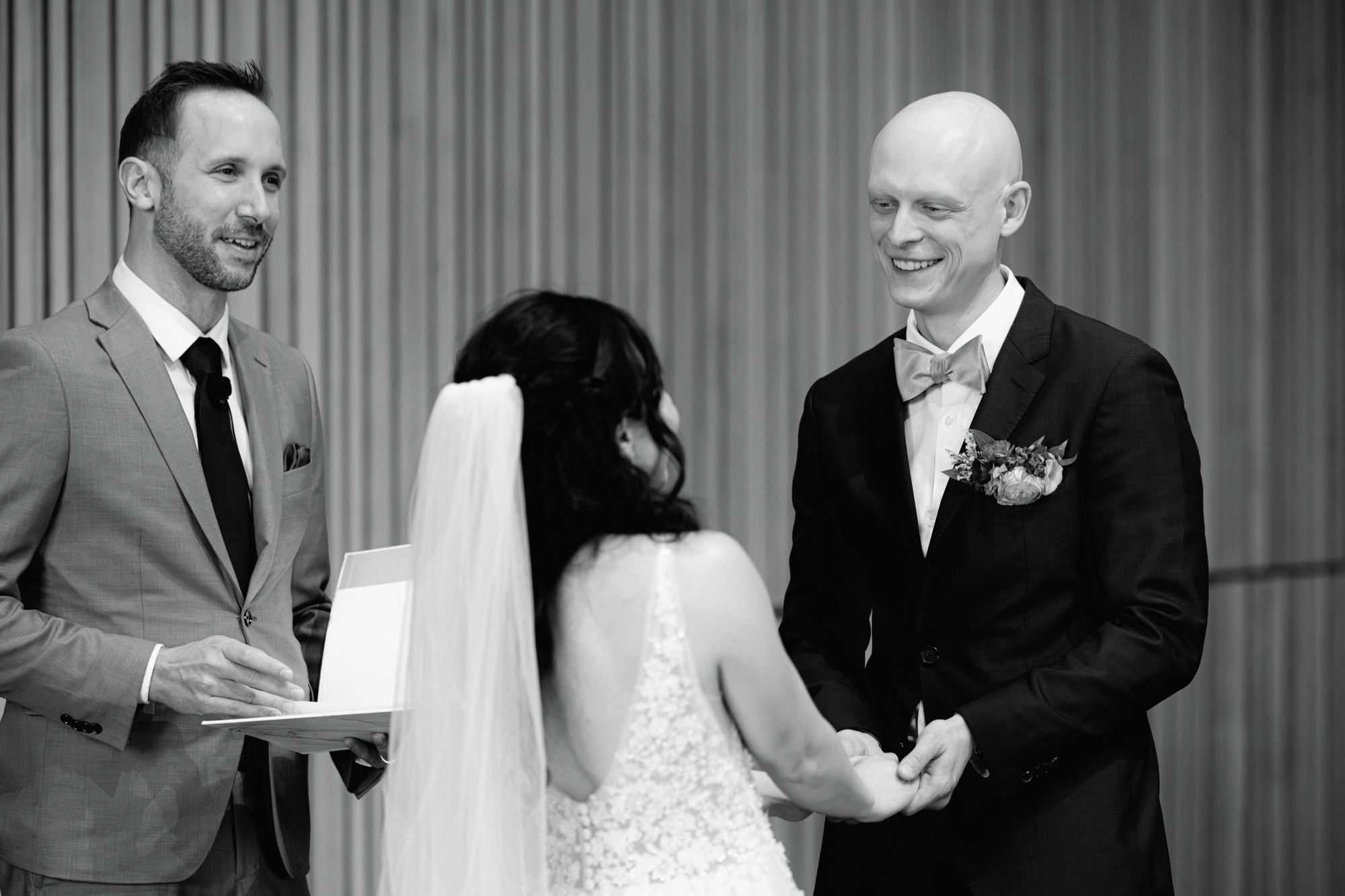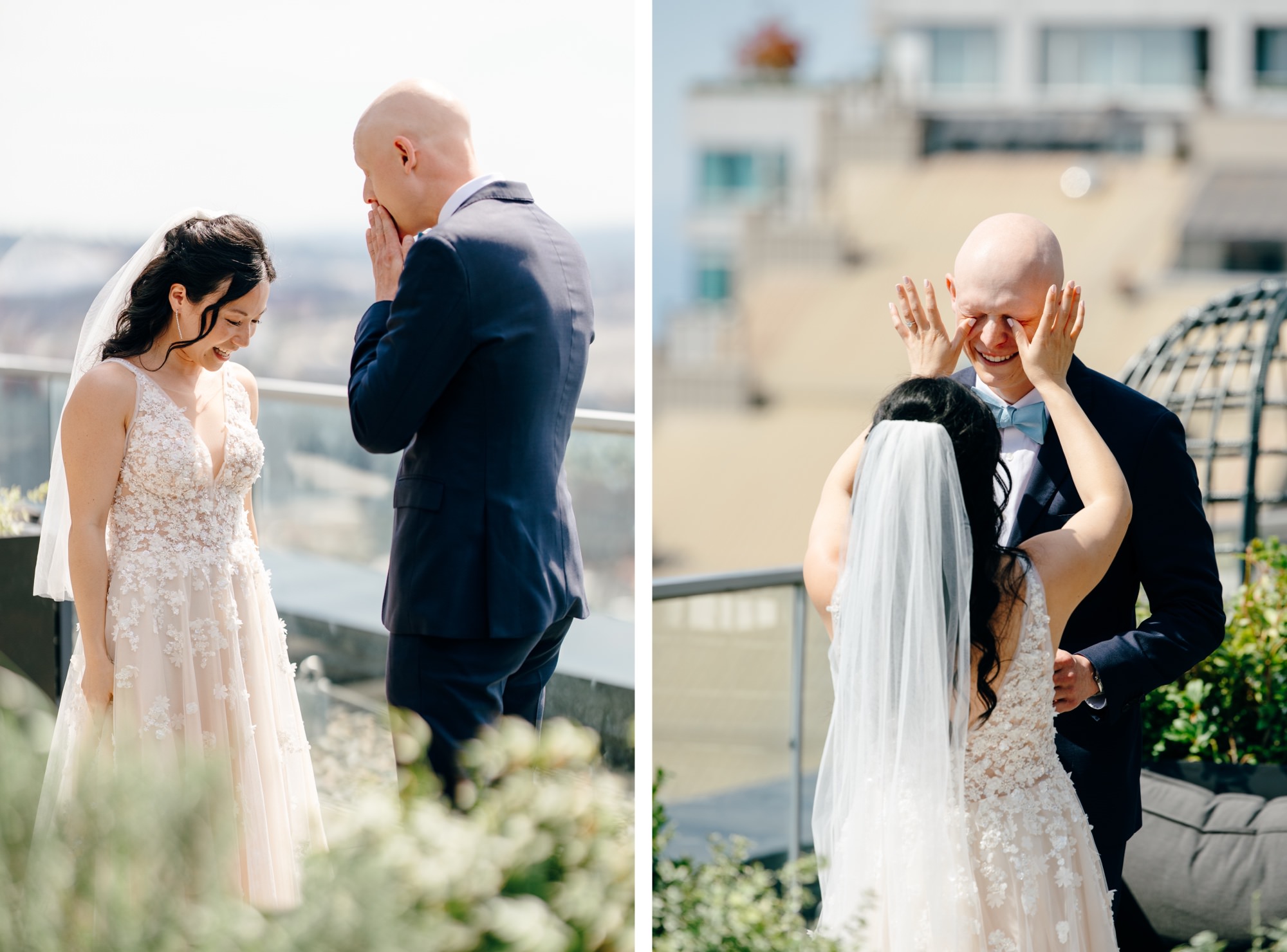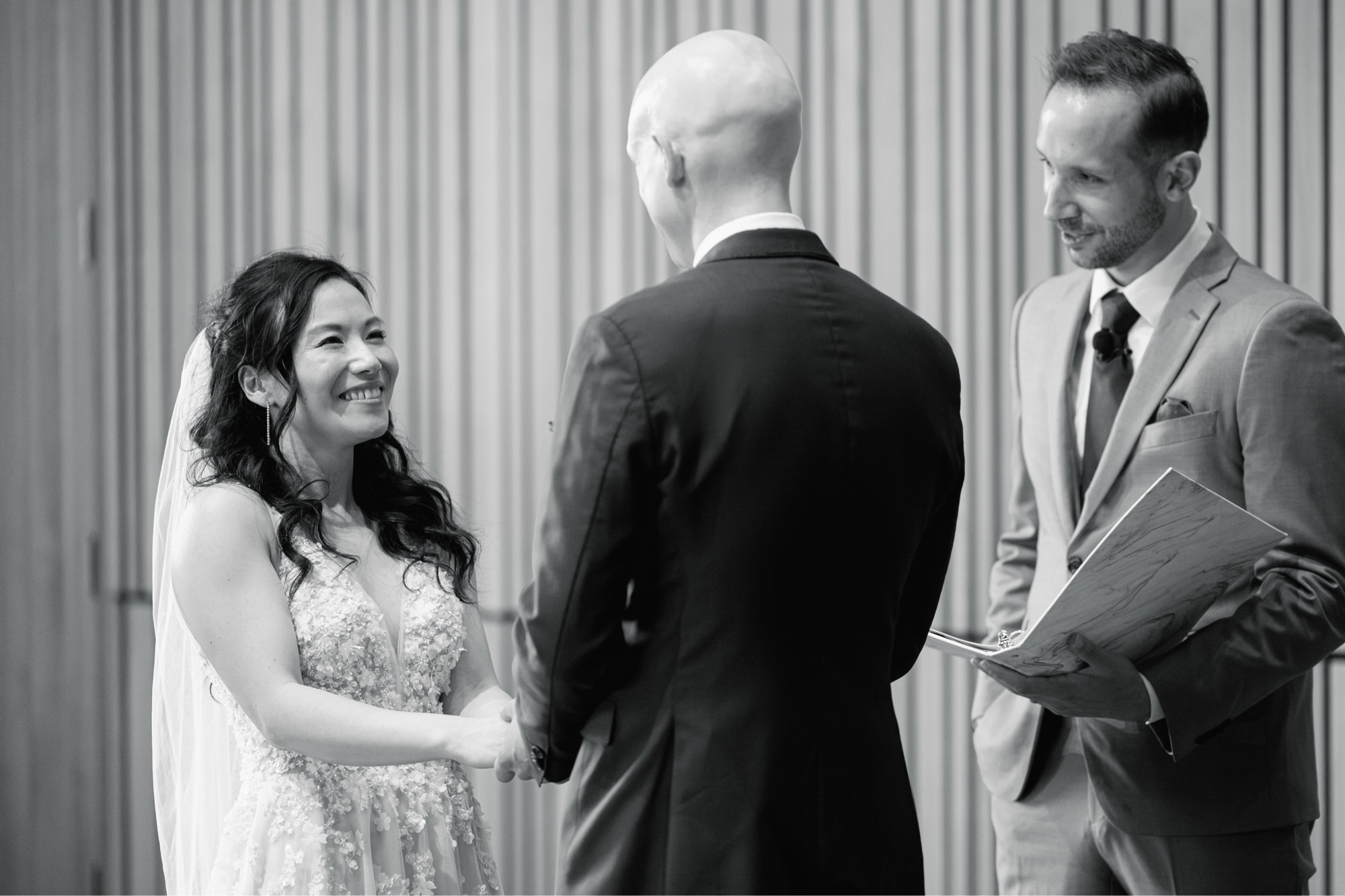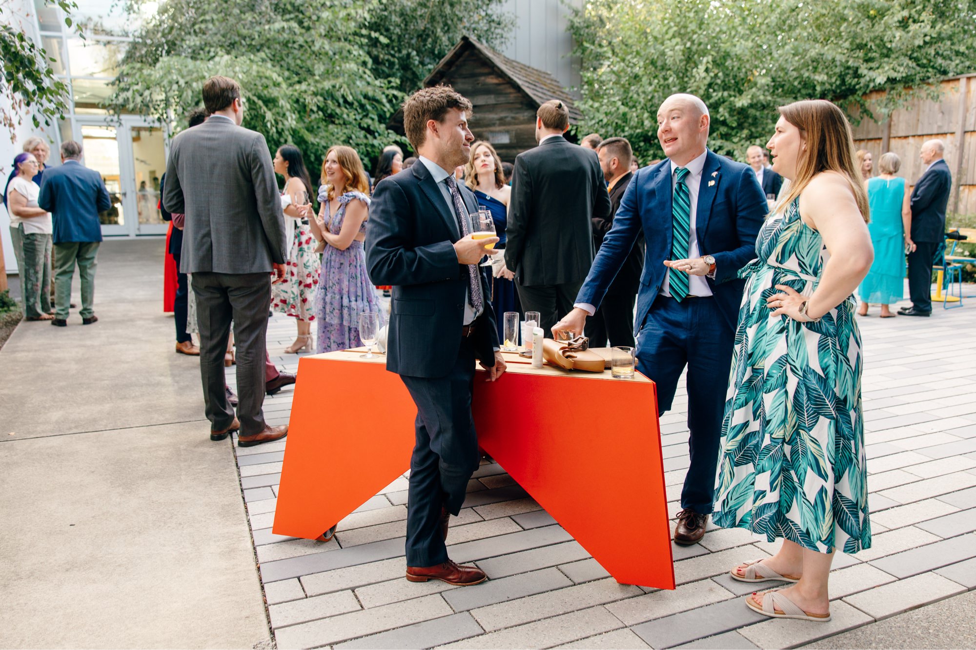 They chose to do their first look at The Nest in downtown Seattle, an intimate spot that perfectly captured the excitement and anticipation before heading to the museum for portraits. Their wedding day also happened to fall on the hottest day of the year, making the museum’s air-conditioned spaces and the shaded East Garden an enormous relief for both the couple and their guests.